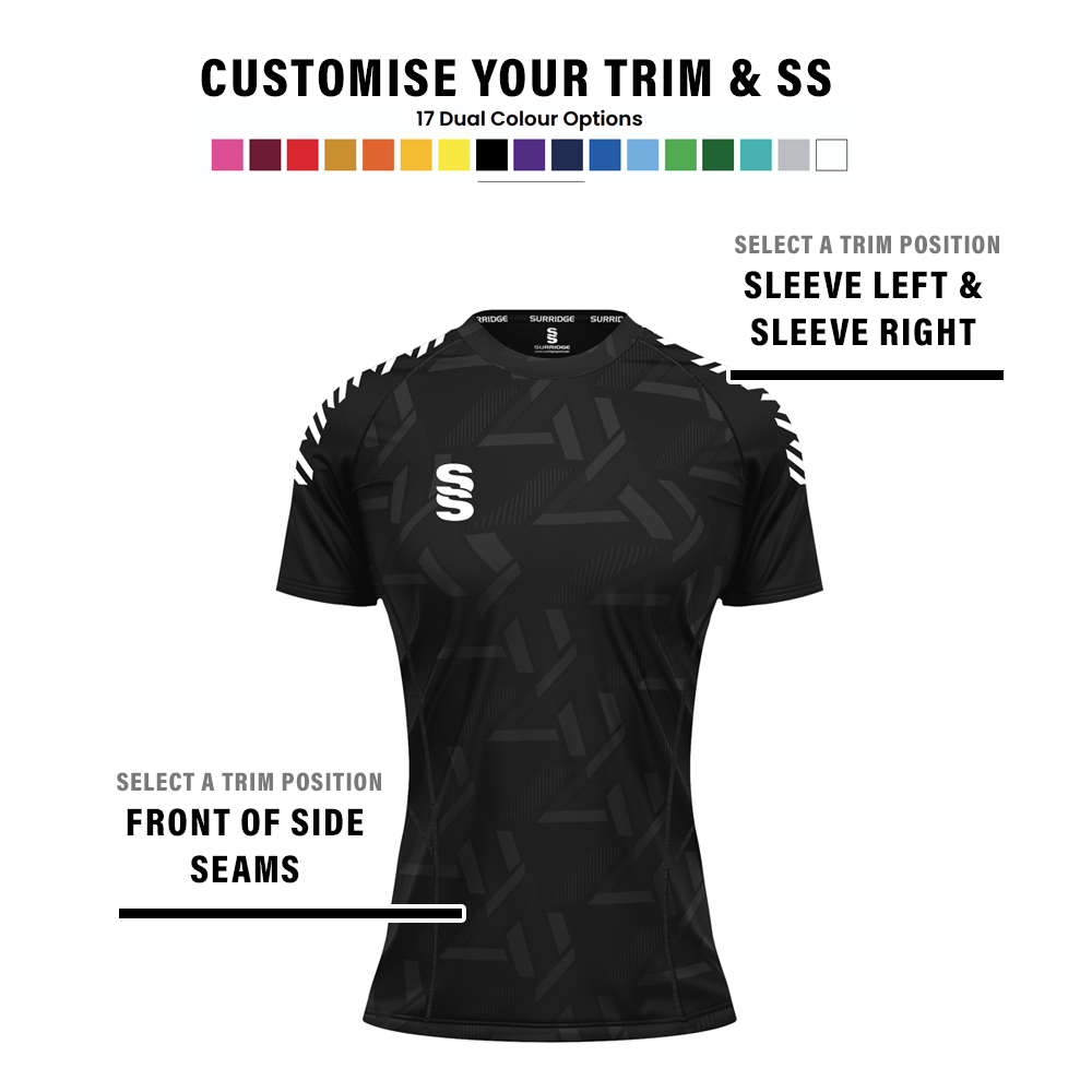 Crew neck fitted polyester interlock material with highly modern print to the from panel